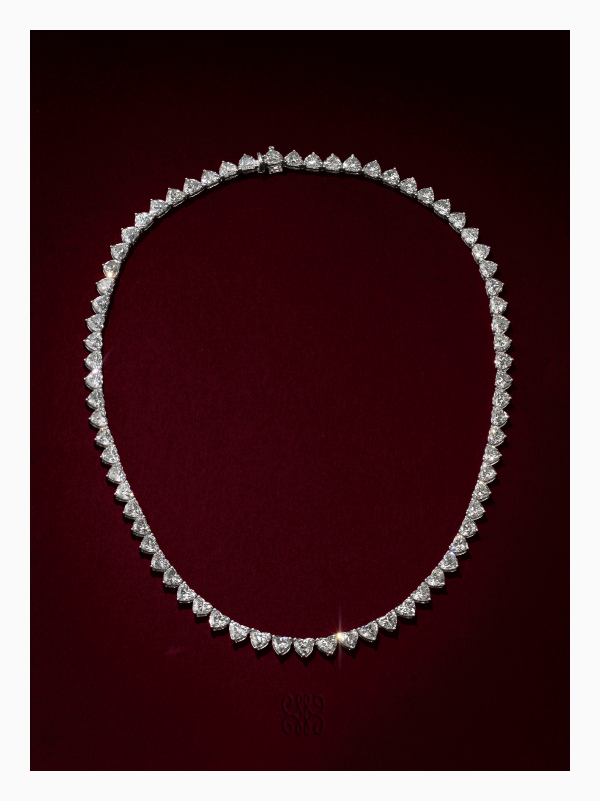 This diamond necklace is a masterwork of heart-cut brilliance: 70 individual diamonds, each approximately 0.50 carats, coming together in perfect harmony to form a luminous 35.00 carat silhouette. Every stone is GIA certified, with F colour and VS clarity — a celebration of purity, precision, and quiet grandeur.