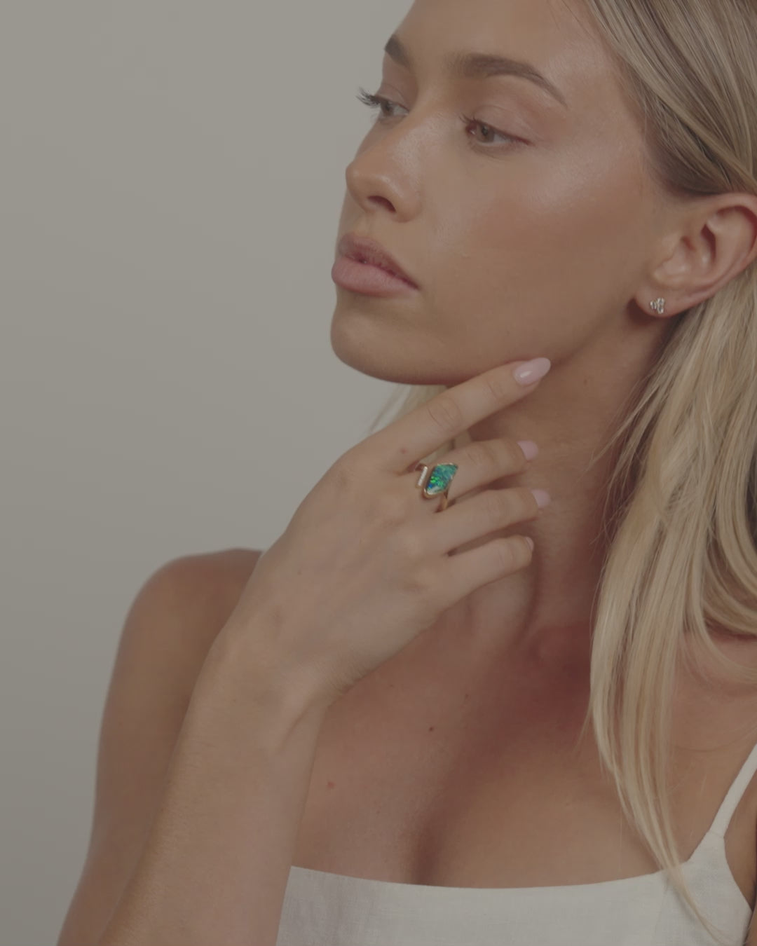 Wildly luminous, endlessly captivating. The Oceana Ring is a tribute to fluid form and rare natural beauty. At its centre, a 4.26ct Australian boulder opal glows with shifting tones of ocean blue, forest green, and deep violet, its organic shape embraced by a sculptural 18k yellow gold band.